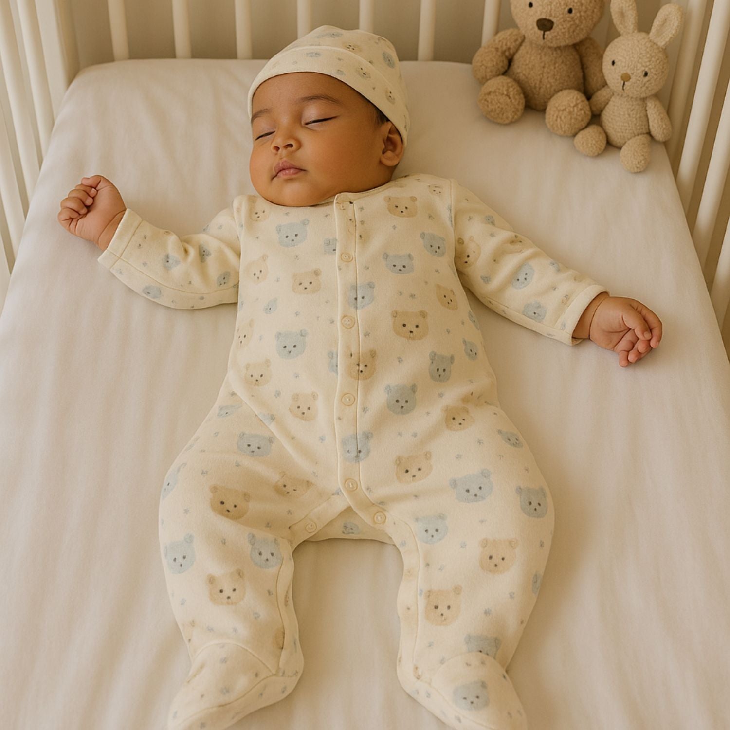 Ternura de pies a cabeza. Este enterizo con delicado estampado de ositos y gorrito a juego está confeccionado en algodón Pima, reconocido por su suavidad incomparable y durabilidad. Atemporal y delicado, es perfecto para acompañar a tu bebé en sus dulces sueños o para disfrutar de un día cómodo en casa. Una opción versátil que combina abrigo, comodidad y estilo en una sola prenda.
